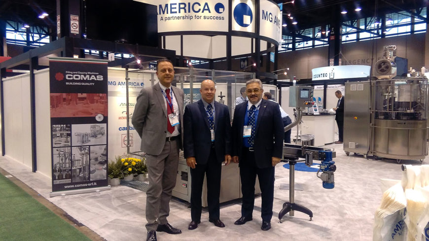 Comas at Expo-Pack in the stand of our partner and distributor for Usa MG-AMERICA, (from left to right) Massimo Cappelli Comas Area Sales, together with Mr. Randy Fraatz MG-America area sales, amd Mr. Fabio Trippodo President of MG-AMERICA.”